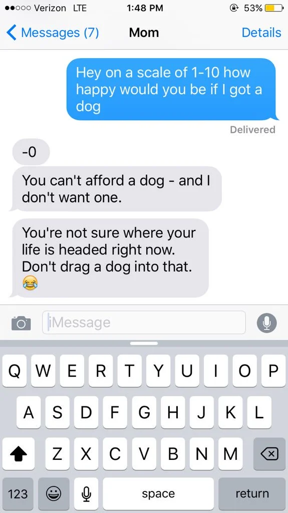 *Here is a screenshot I saved from the time I texted my mom about getting a dog last year and she responded with a critique of my entire adult life.